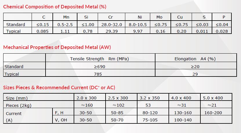 Ini mengendapkan logam las dupleks feritik-austenitik dengan sekitar 40% ferit sehingga memiliki ketahanan retak yang sangat baik. Sangat cocok untuk pengelasan baja tuang Cr29Ni9, baja karbon tinggi, baja perkakas, baja bermasalah serta untuk pengelasan baja yang berbeda.